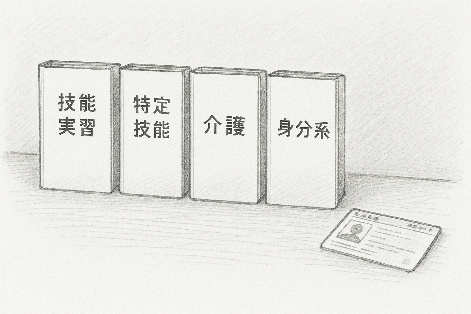 育成就労(施行予定) | 人材育成+就労 | N4相当(予定) | 原則3年 | 2024年法改正で創設、2027年までに施行予定(現時点では未施行) |